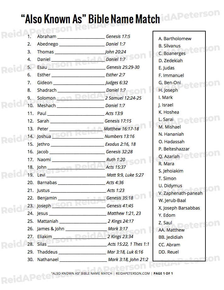 This activity sheet consists of thirty Bible character names and thirty alternate names they were known by. Do your best to match which names belong with which characters. Some might be pretty obscure, make use of the Bible verse references included to find a clue. This game includes two pages: the matching activity sheet and the answer key.