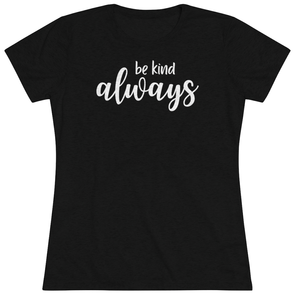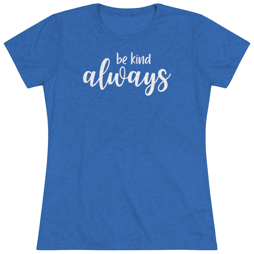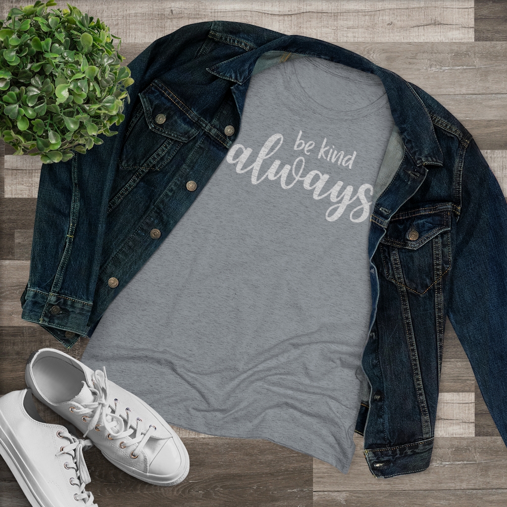 “Be Kind Always” design on a Next Level women’s triblend tee. This cozy and perfect fit t-shirt is a triple fabric blend that is incredibly soft with great drape, stretch, and recovery. Made of polyester, combed ring-spun cotton and rayon, it is not only a cozy beauty but also made to last. Get the perfect basic with a vintage look.