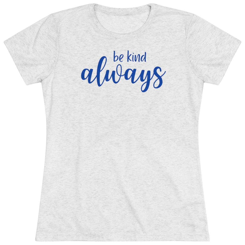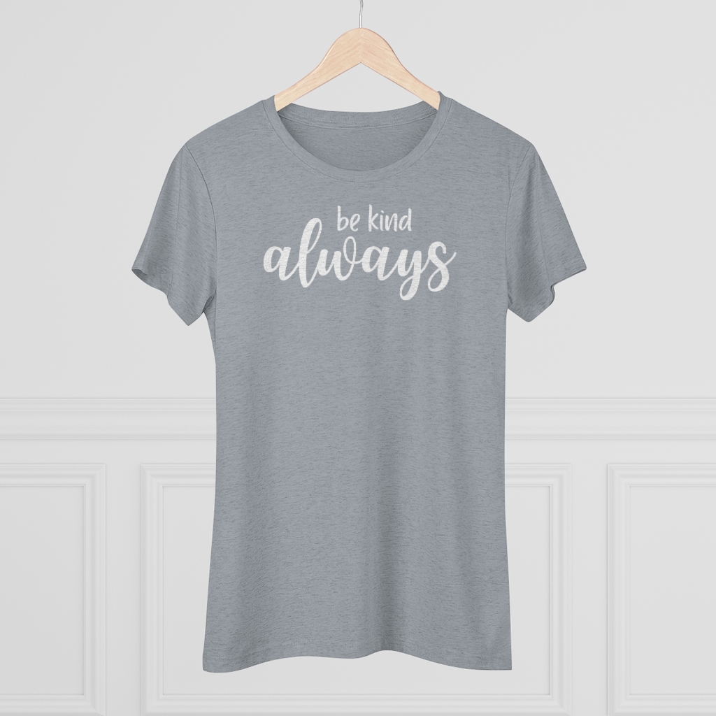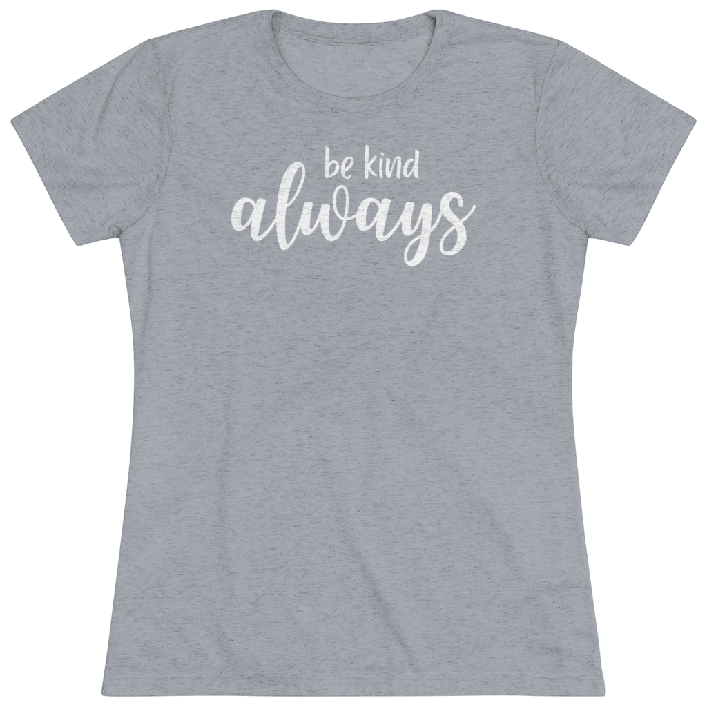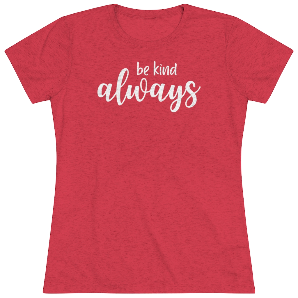 “Be Kind Always” design on a Next Level women’s triblend tee. This cozy and perfect fit t-shirt is a triple fabric blend that is incredibly soft with great drape, stretch, and recovery. Made of polyester, combed ring-spun cotton and rayon, it is not only a cozy beauty but also made to last. Get the perfect basic with a vintage look.