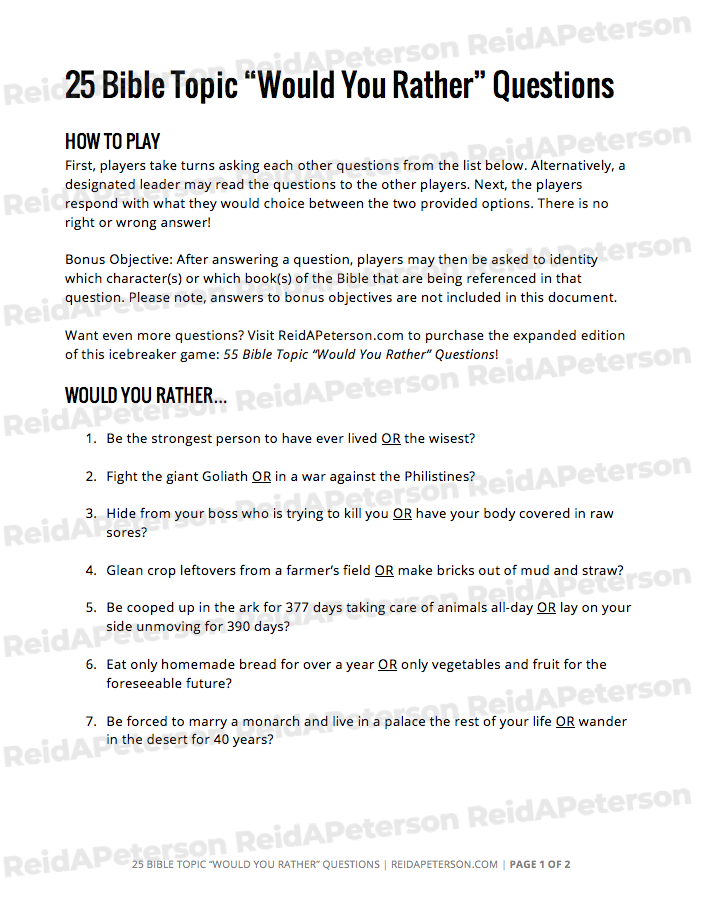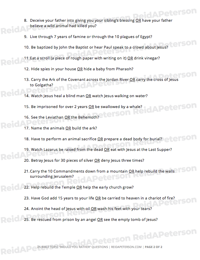 This “would you rather” Bible game is one of many digital print-and-play activities by Reid A. Peterson.  This game is ideal for use at youth group, kids ministry class, or at home. This product is free and includes the rights for personal usage only. Please contact Reid directly with any questions or comments about this product. Please help share this game with others by sharing it to social media venues such as Pinterest. If you’re looking to download other Bible games, view the Bible Games archive. If you’re looking for a catalogue of all games, view the full Games archive. Lastly, don’t miss out on the Paper Game Printables Super Pack for a bundle of discounted games of all kinds.