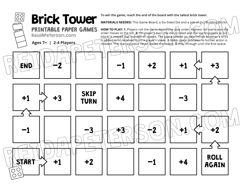 2. On player’s turn, the die is rolled and the starting piece (a 2×2 block) is moved that number of spaces. The space landed on determines whether a brick is added to or removed from a player’s tower. A blank space indicates no further action is needed. The starting piece never leaves the board.