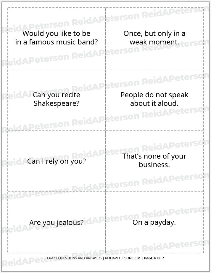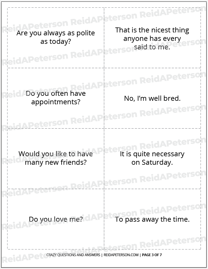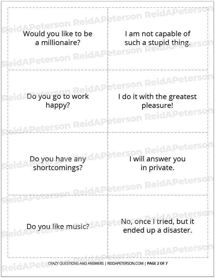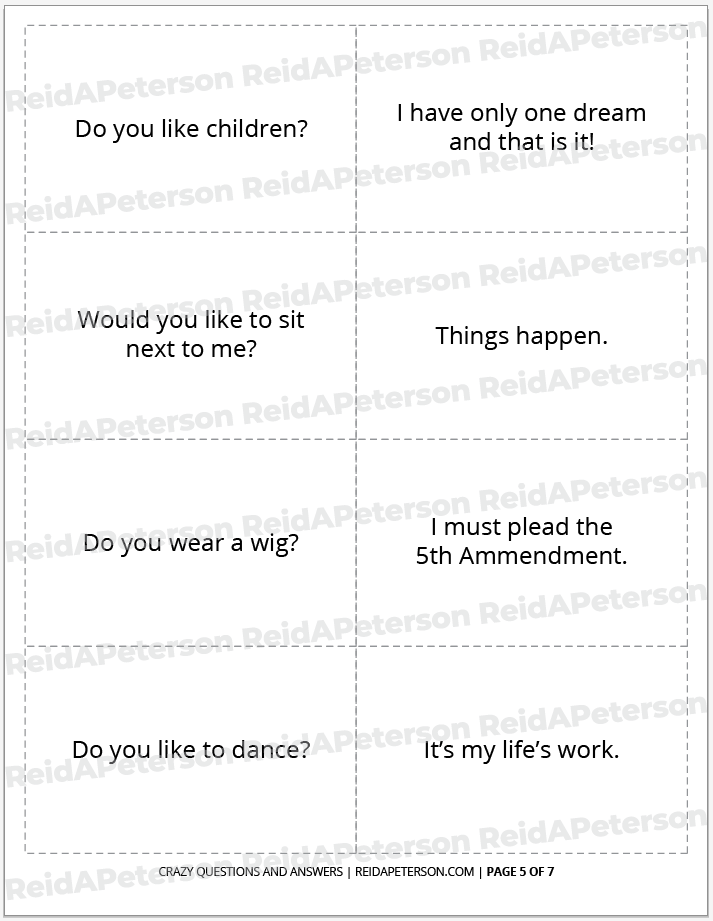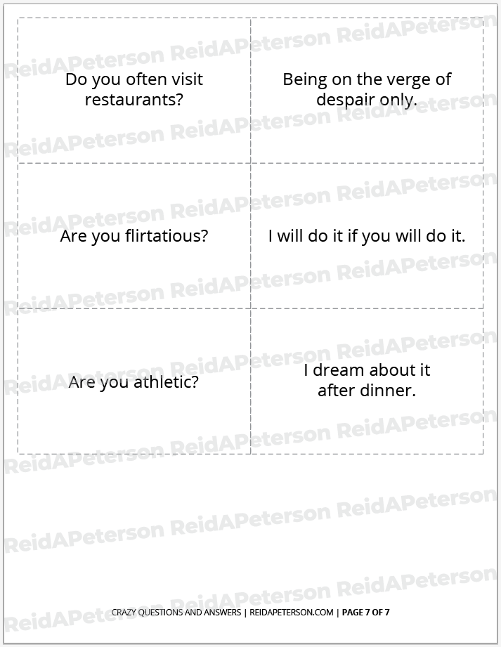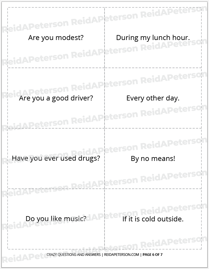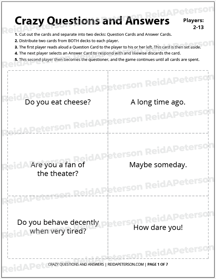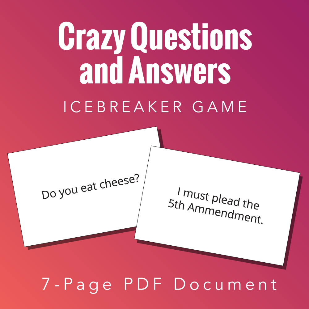 “Crazy Questions and Answers” is a free icebreaker game by Reid A. Peterson. This product includes the rights for personal usage only. Please contact Reid directly with any questions or comments about this product. Please help share this game with others by sharing it to social media venues such as Pinterest. If you’re looking to download other icebreaker games, view the Icebreaker Games archive. If you’re looking for a catalogue of all games, view the full Games archive. Lastly, don’t miss out on the Paper Game Printables Super Pack for bundle of discounted games of all kinds. These products may not be altered, re-distributed or re-sold.