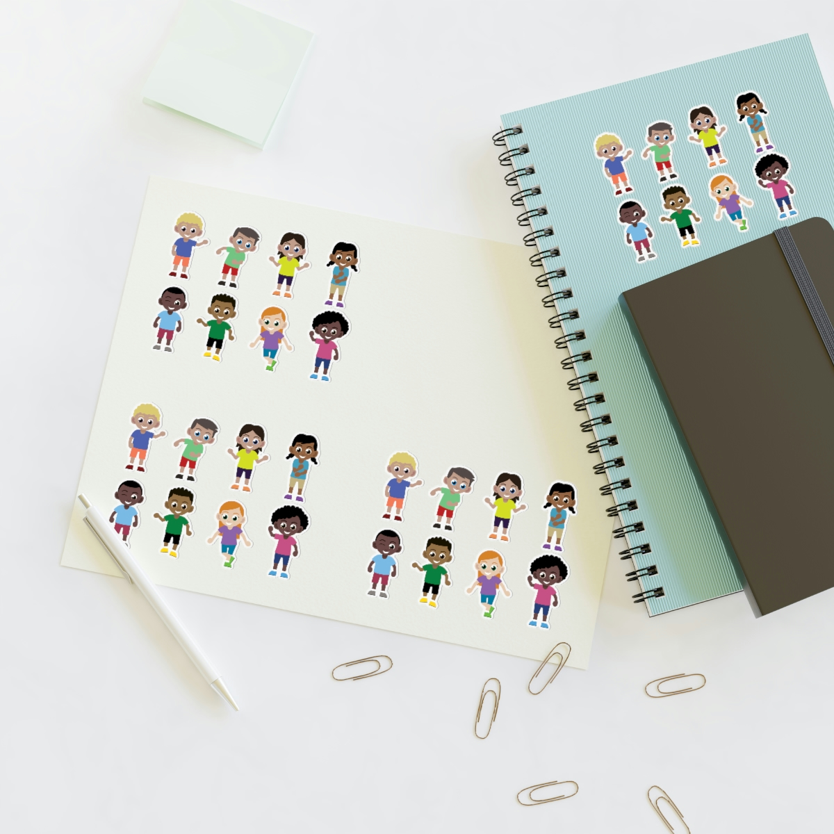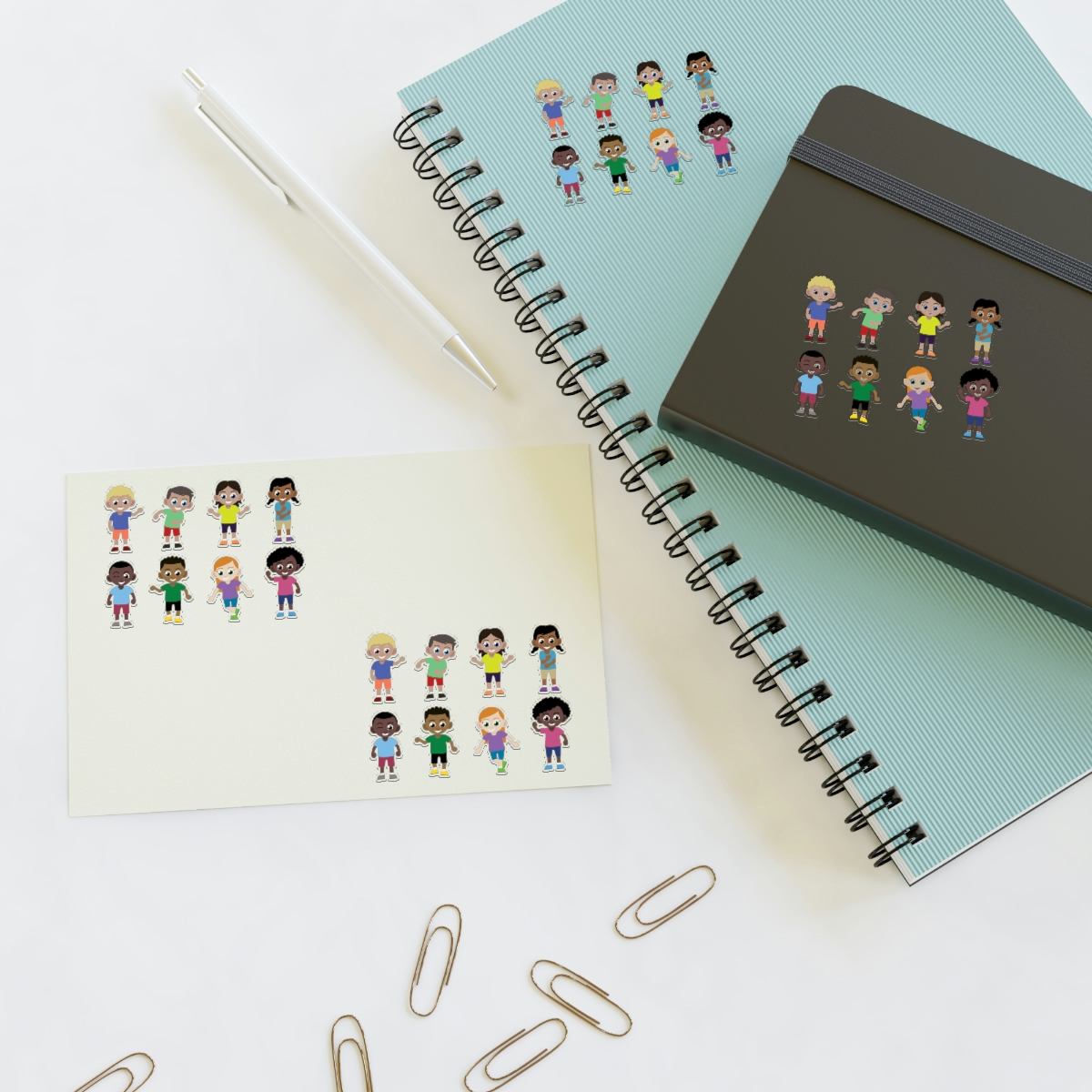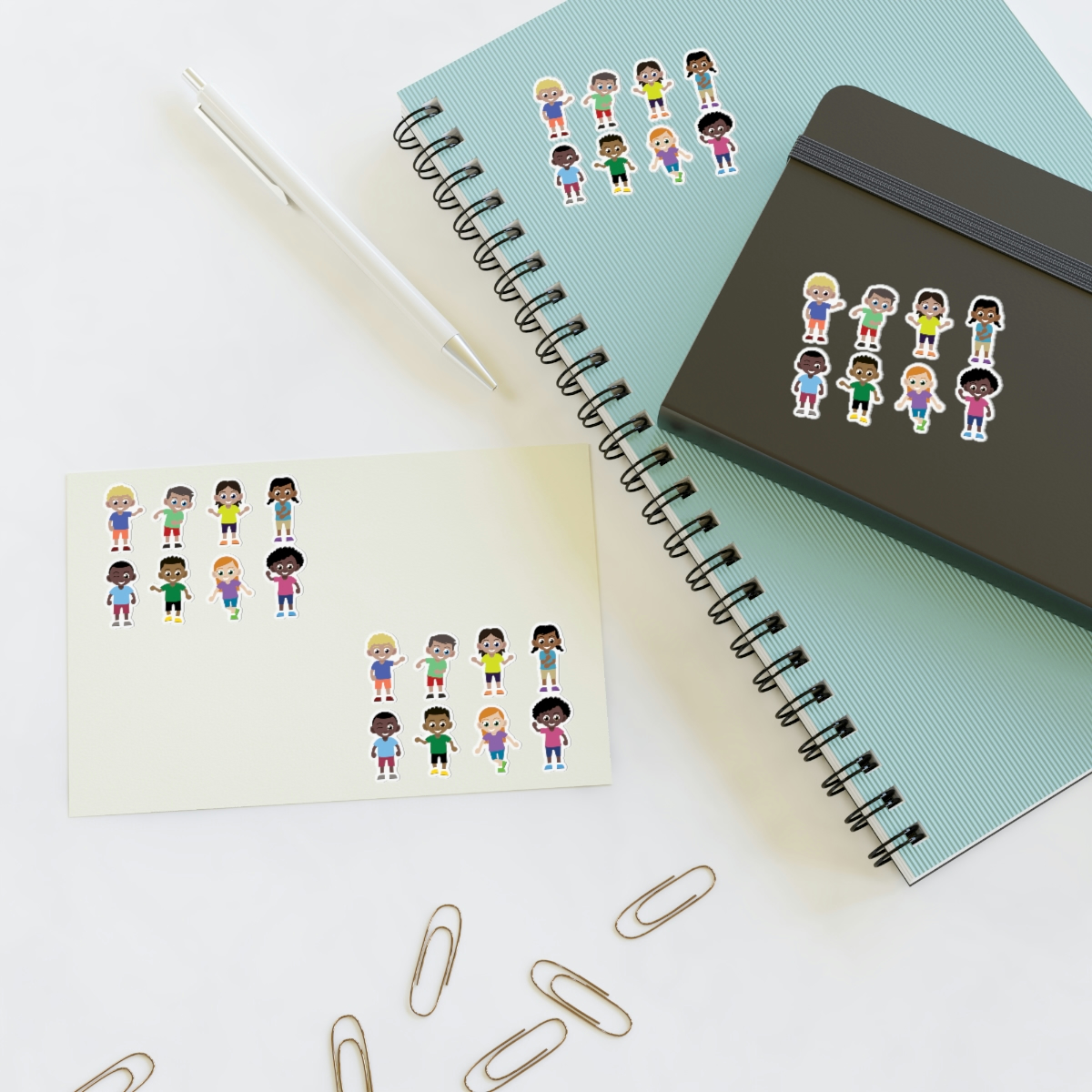 “Hello Children” design on a vinyl sticker sheet: includes 24 stickers total. Available in white and transparent versions.
