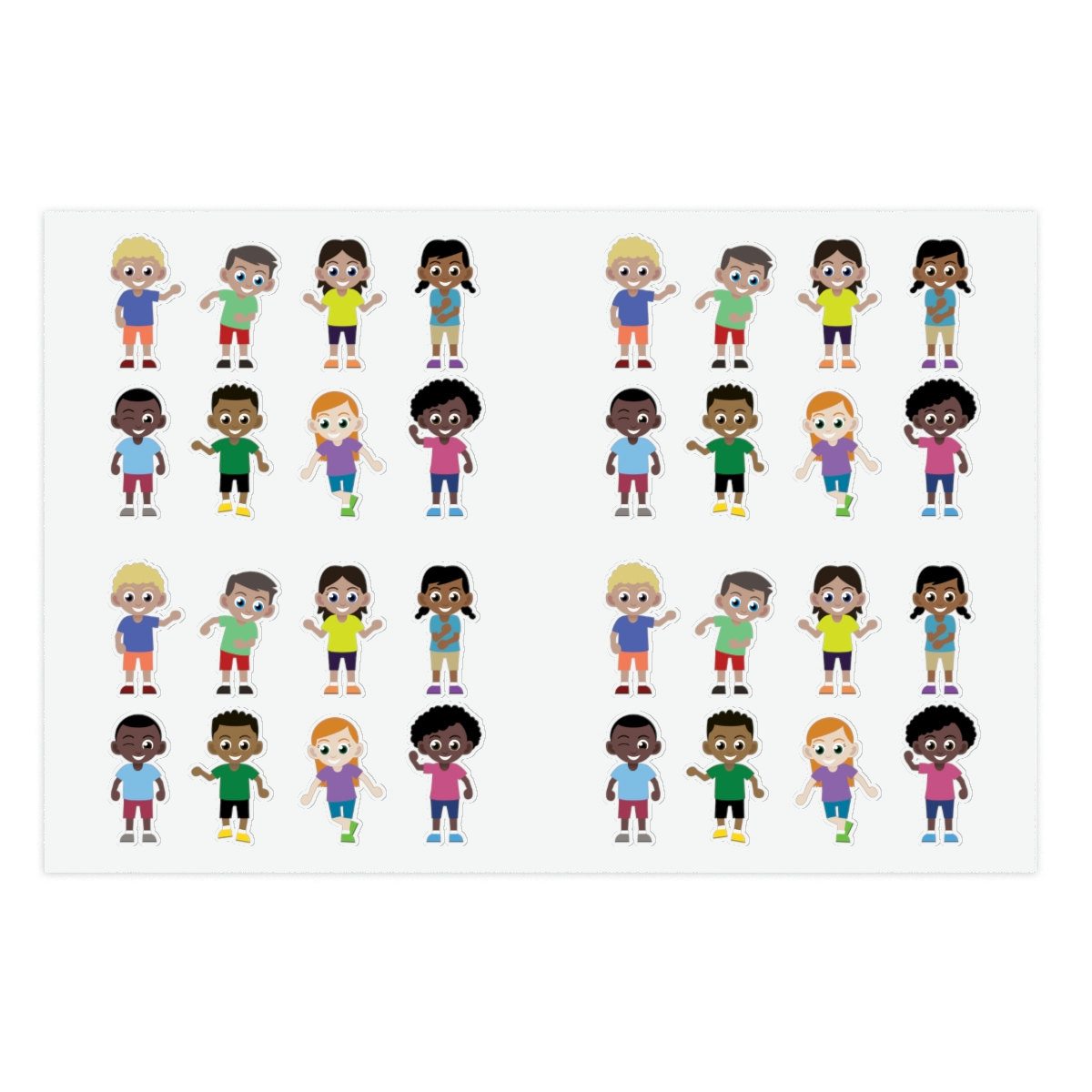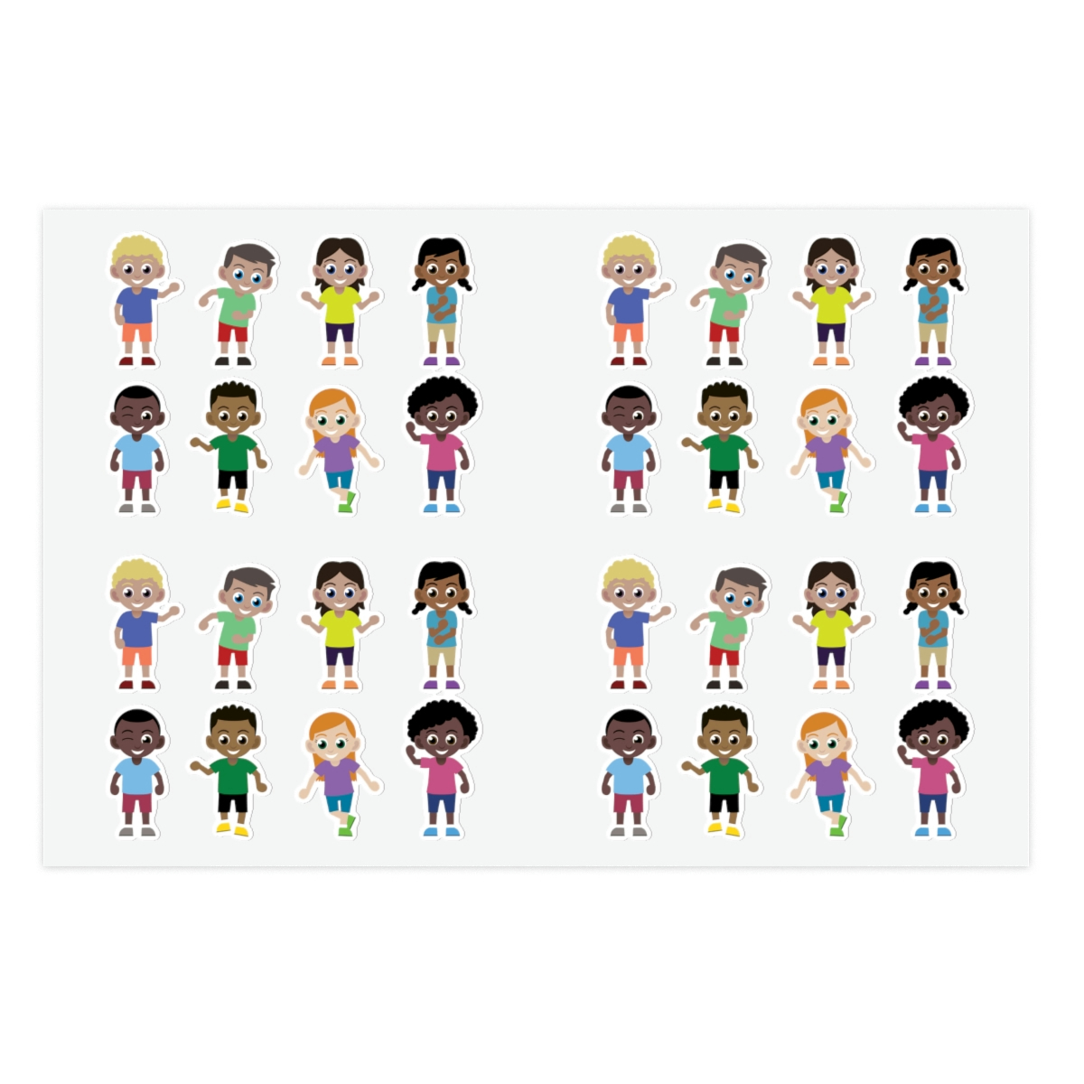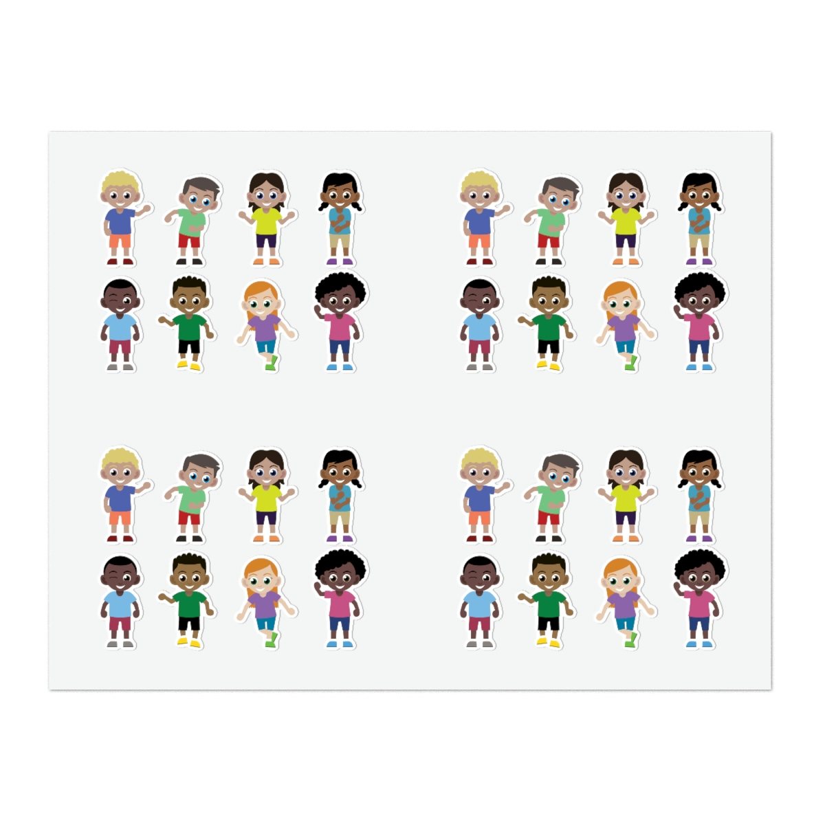 “Hello Children” design on a vinyl sticker sheet: includes 24 stickers total. Available in white and transparent versions.
