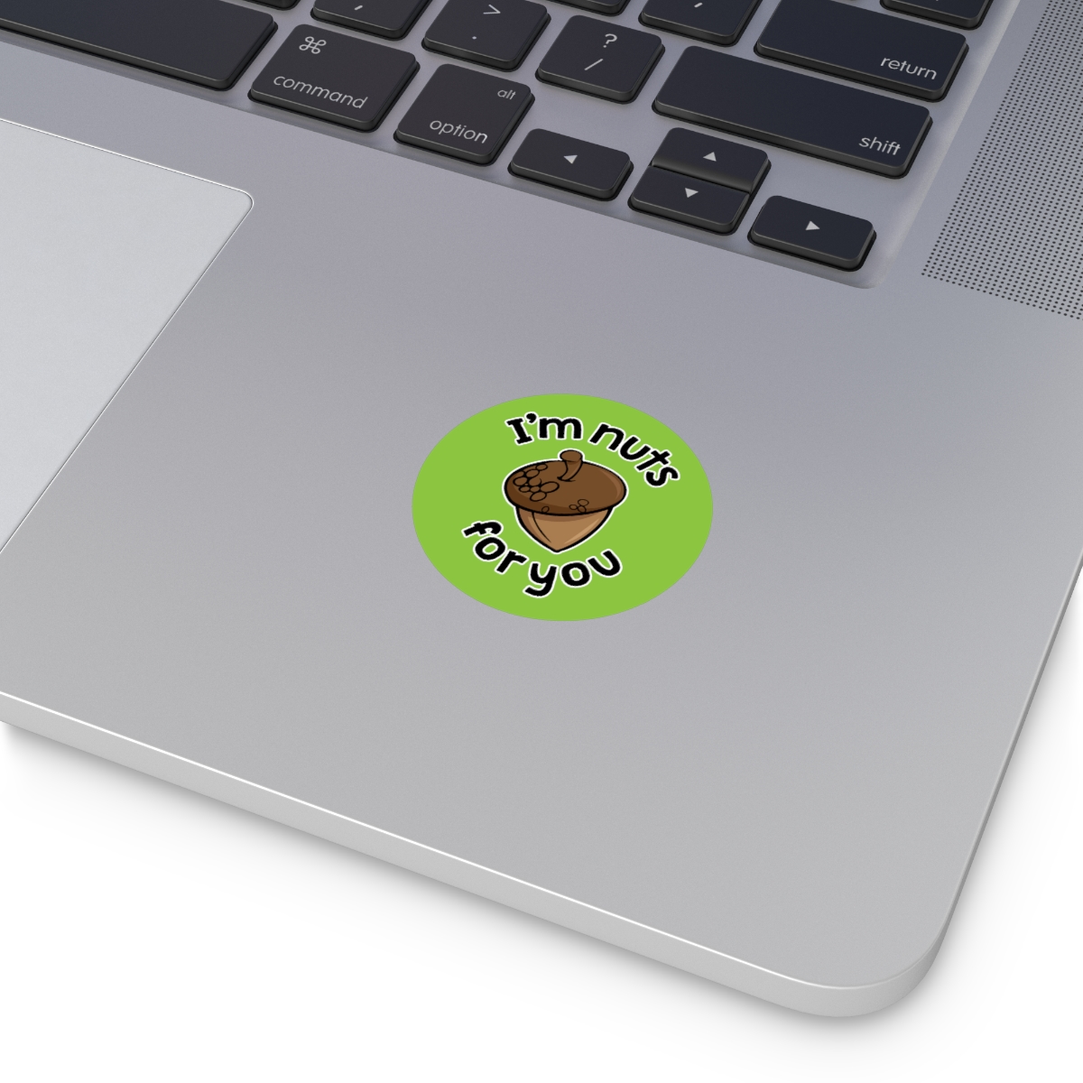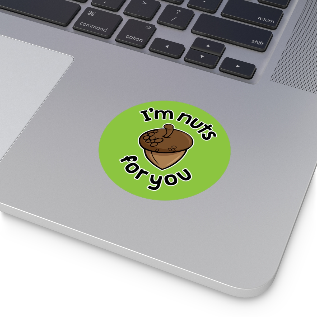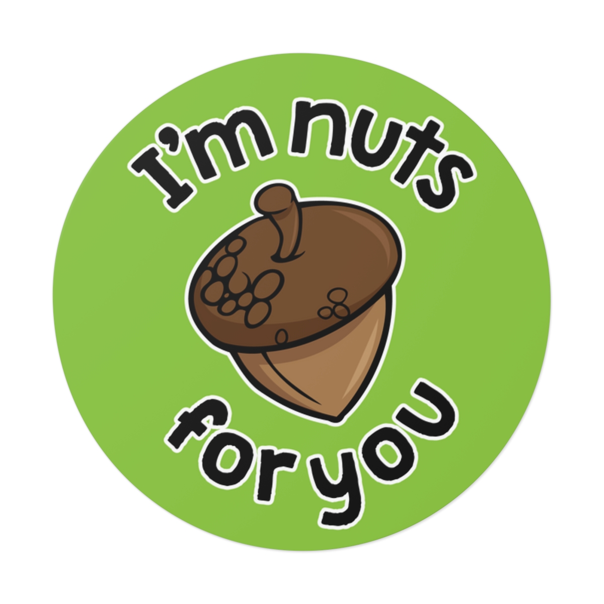 “I’m Nuts For You” design on Round Vinyl Stickers. Custom circle stickers are great for adding a touch of personality to any surface. These are rated to last over six years due to high-quality production. The base materials are premium vinyl and vibrant inks. The design layer is covered by a UV resistant laminate. If removal is necessary, the adhesive backing won’t leave residue behind.