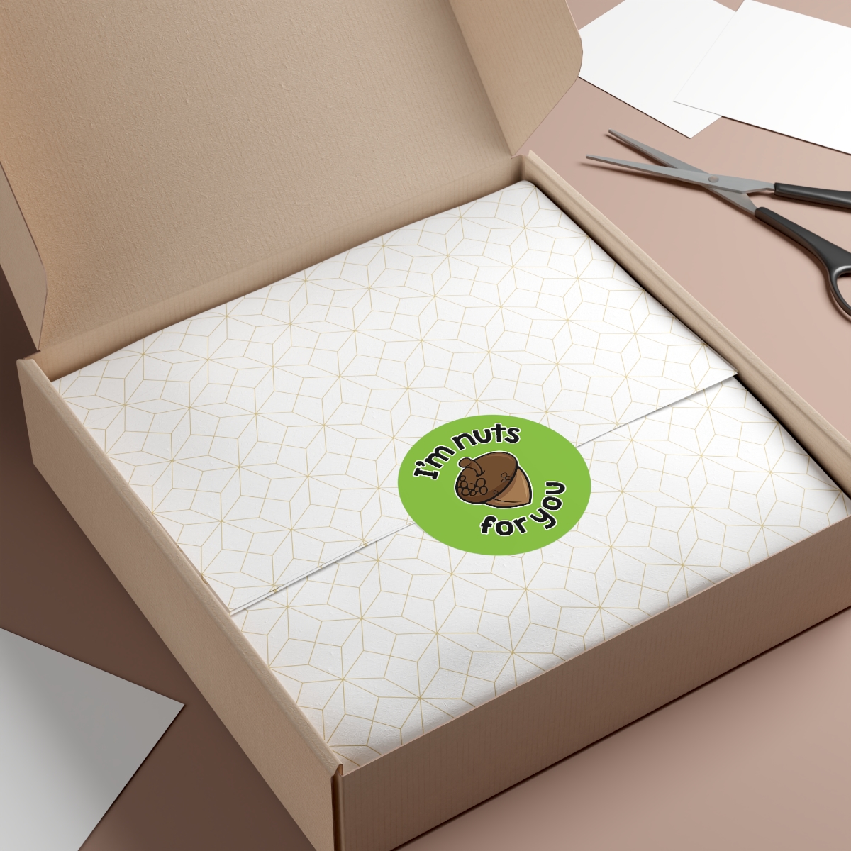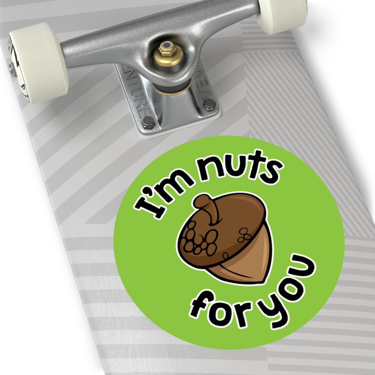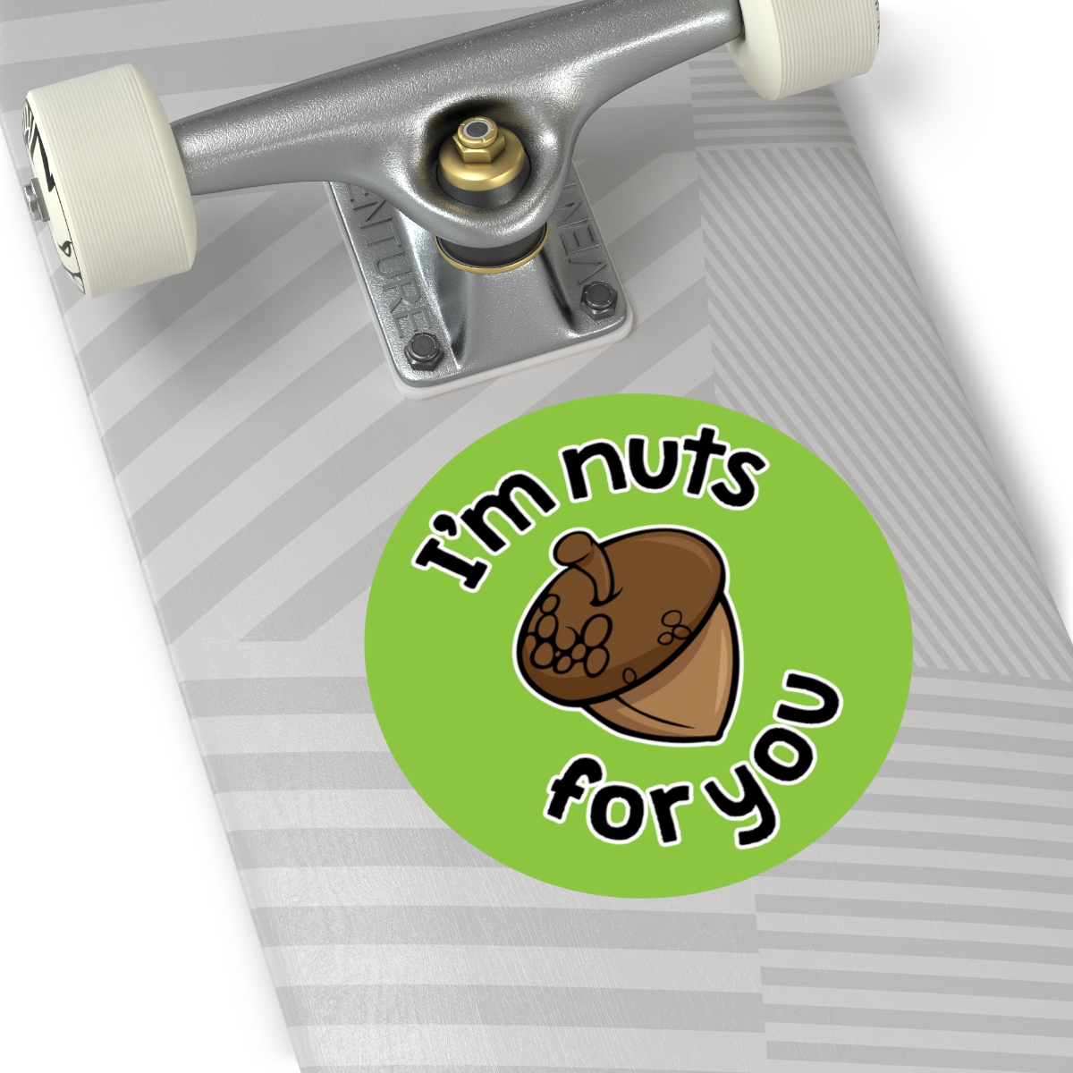 “I’m Nuts For You” design on Round Vinyl Stickers. Custom circle stickers are great for adding a touch of personality to any surface. These are rated to last over six years due to high-quality production. The base materials are premium vinyl and vibrant inks. The design layer is covered by a UV resistant laminate. If removal is necessary, the adhesive backing won’t leave residue behind.