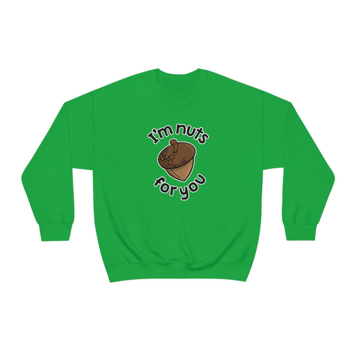 “I’m Nuts For You” design on a Gildan unisex Heavy Blend Crewneck Sweatshirt. Ideal for any situation, a unisex heavy blend crewneck sweatshirt is pure comfort. These garments are made from polyester and cotton. The collar is ribbed knit, so it retains its shape even after washing. There are no itchy side seams on these sweaters.