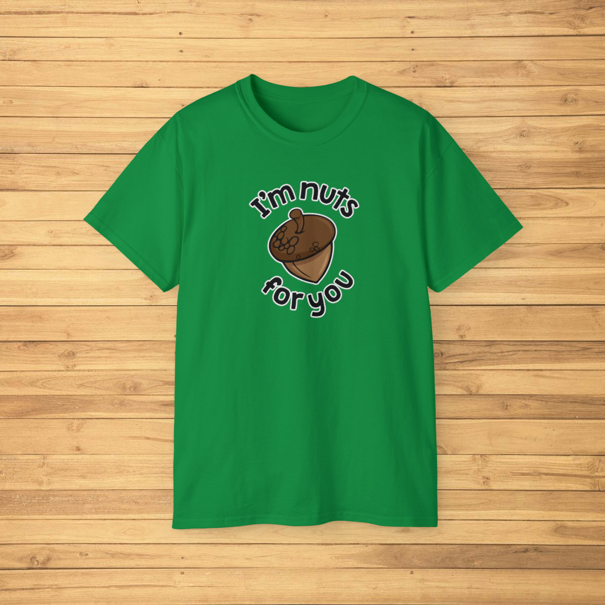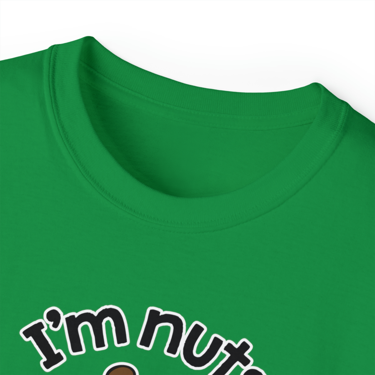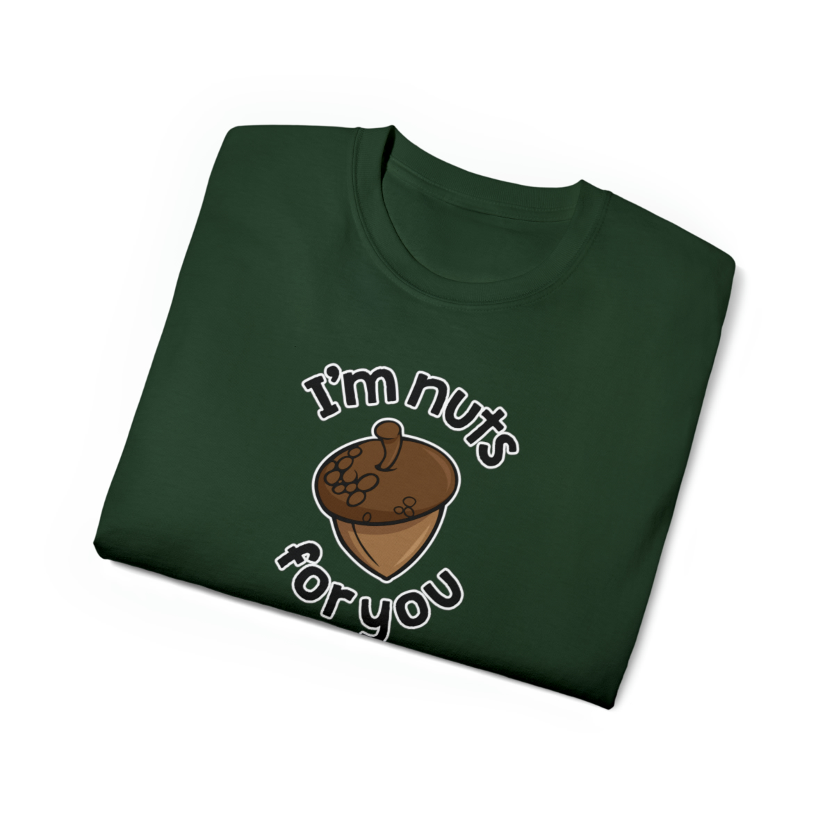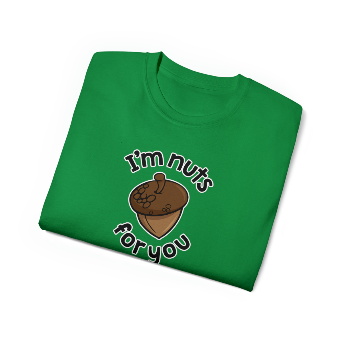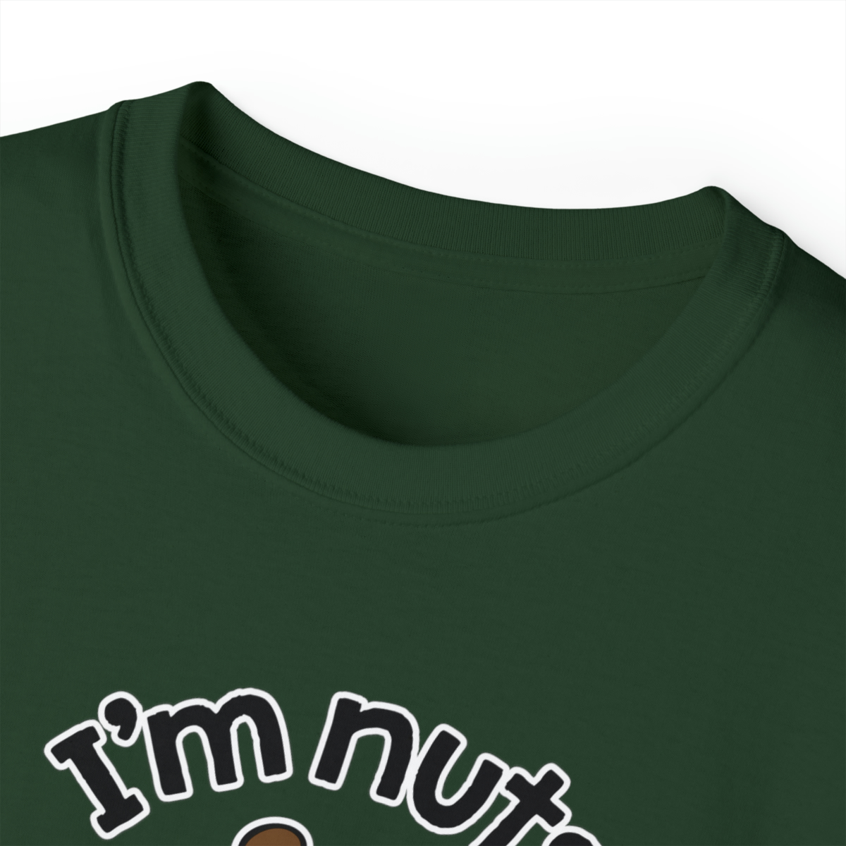 “I’m Nuts For You” design on a Gildan Unisex Ultra Cotton Tee. The shoulders are tapped for a good upper-body fit. There are no side seams, ensuring a clean, unbroken flow. The collar has ribbed knitting for improved elasticity. The materials that went into this product are sustainably sourced and economically friendly.
