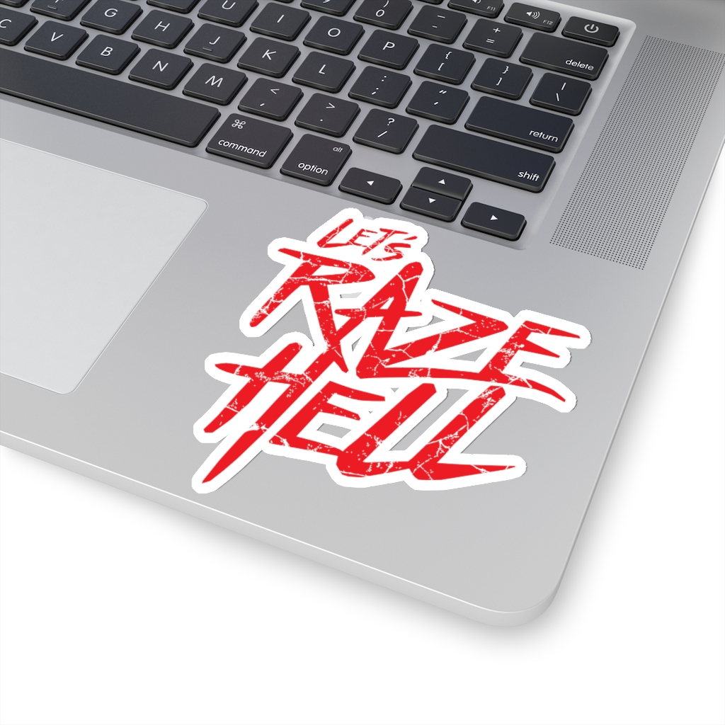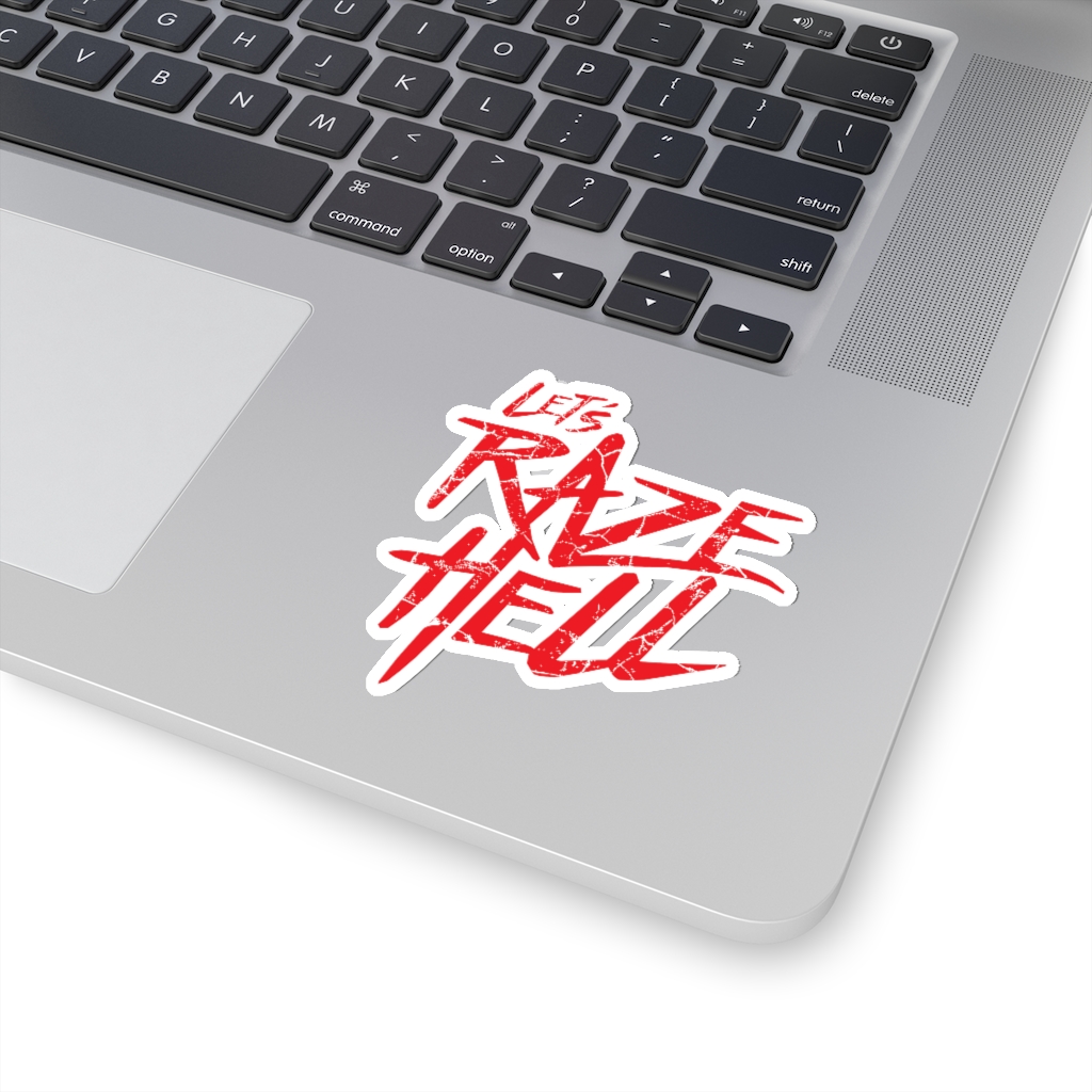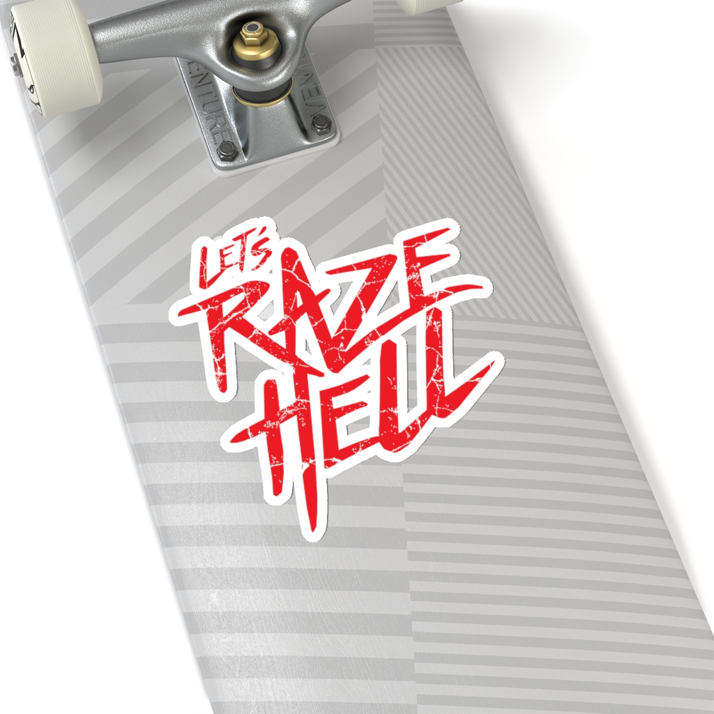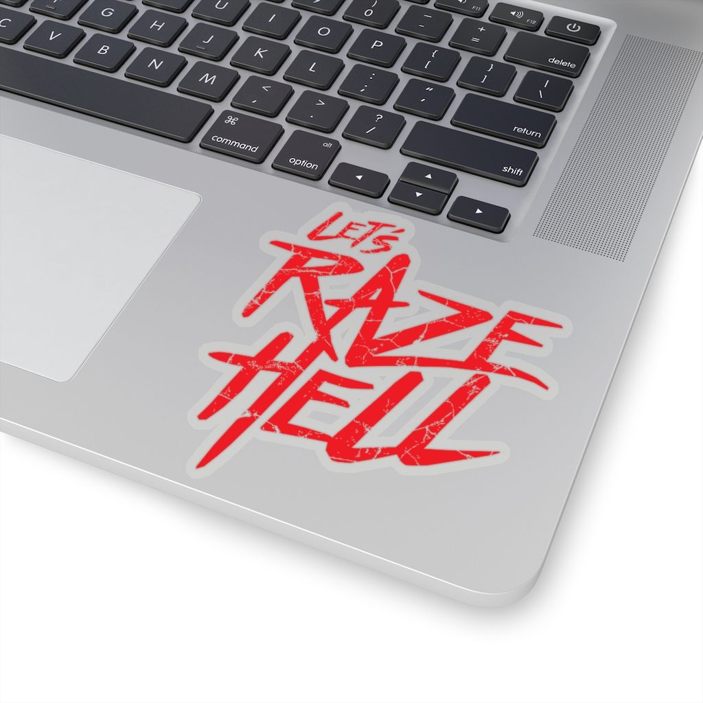 “Let’s Raze Hell” design on kiss-cut sticker. A kiss cut provides you with the ultimate flexibility for implementing your vision—this method cuts the sticker into any shape you desire, while leaving the back intact so that it can be smoothly peeled off the page.
