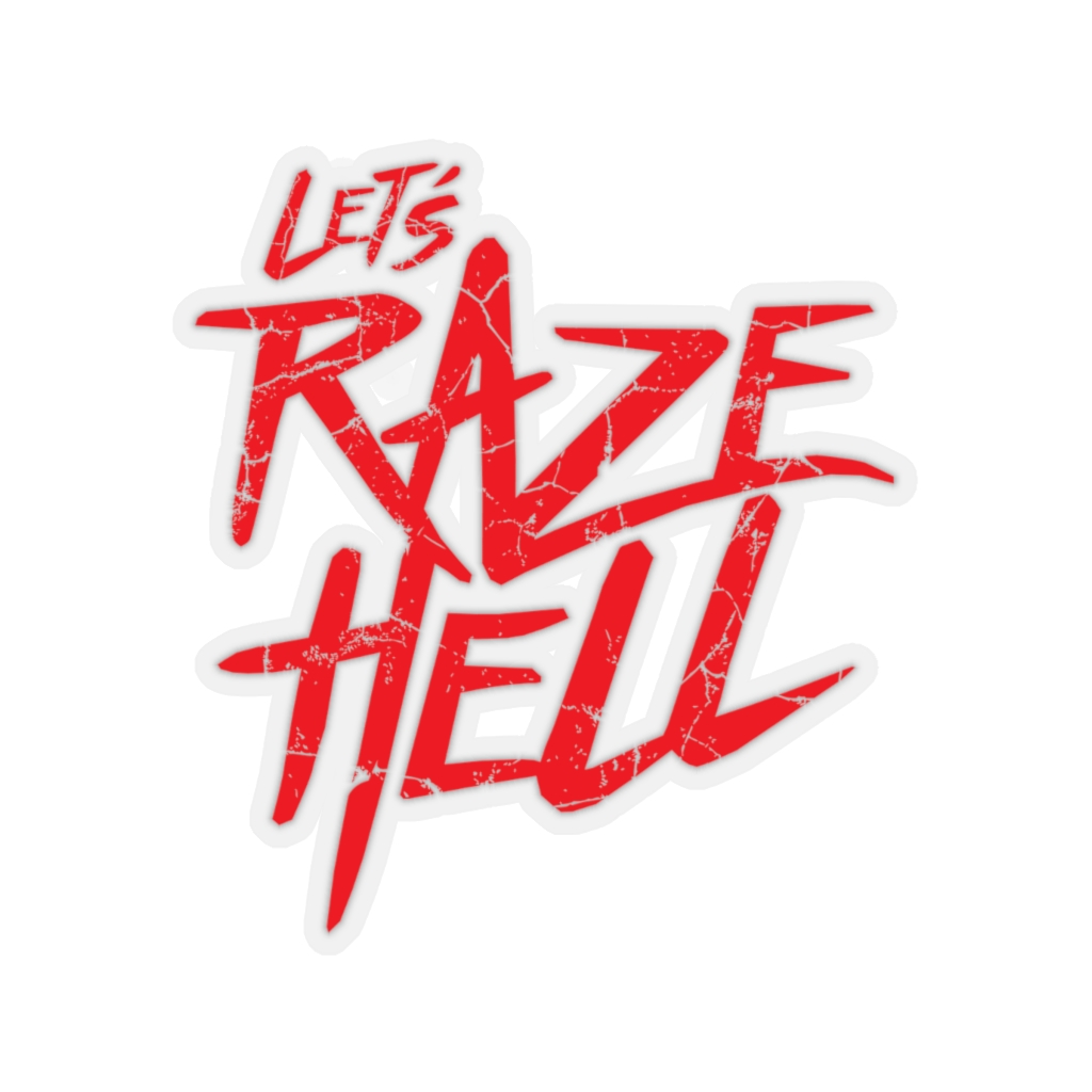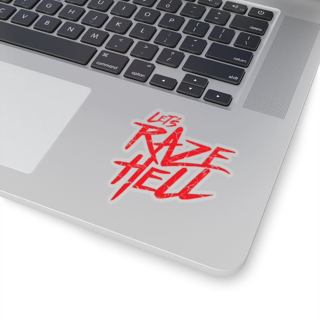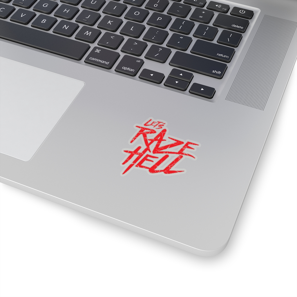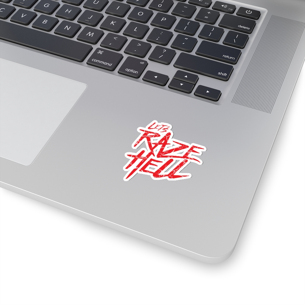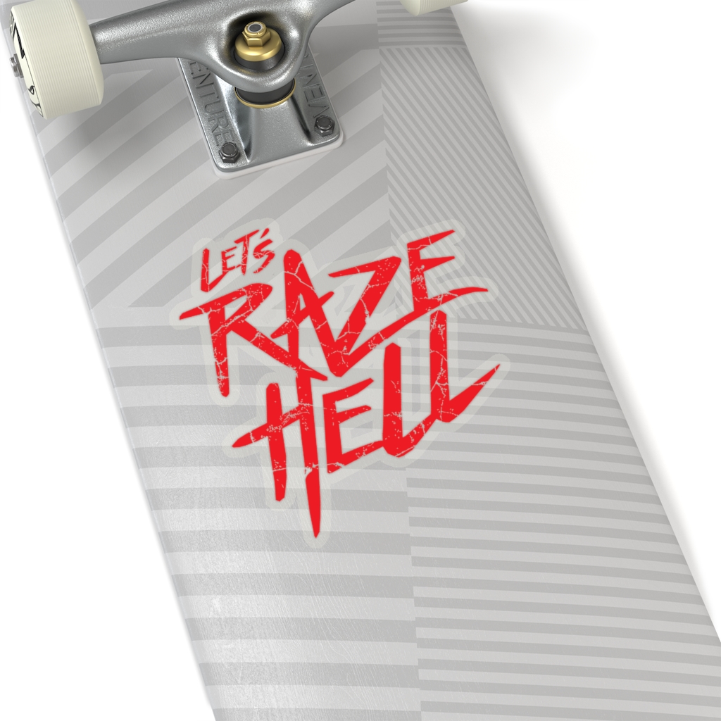 “Let’s Raze Hell” design on kiss-cut sticker. A kiss cut provides you with the ultimate flexibility for implementing your vision—this method cuts the sticker into any shape you desire, while leaving the back intact so that it can be smoothly peeled off the page.