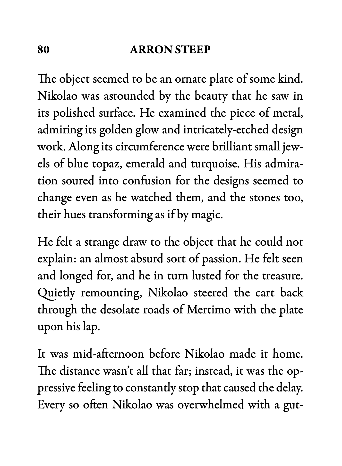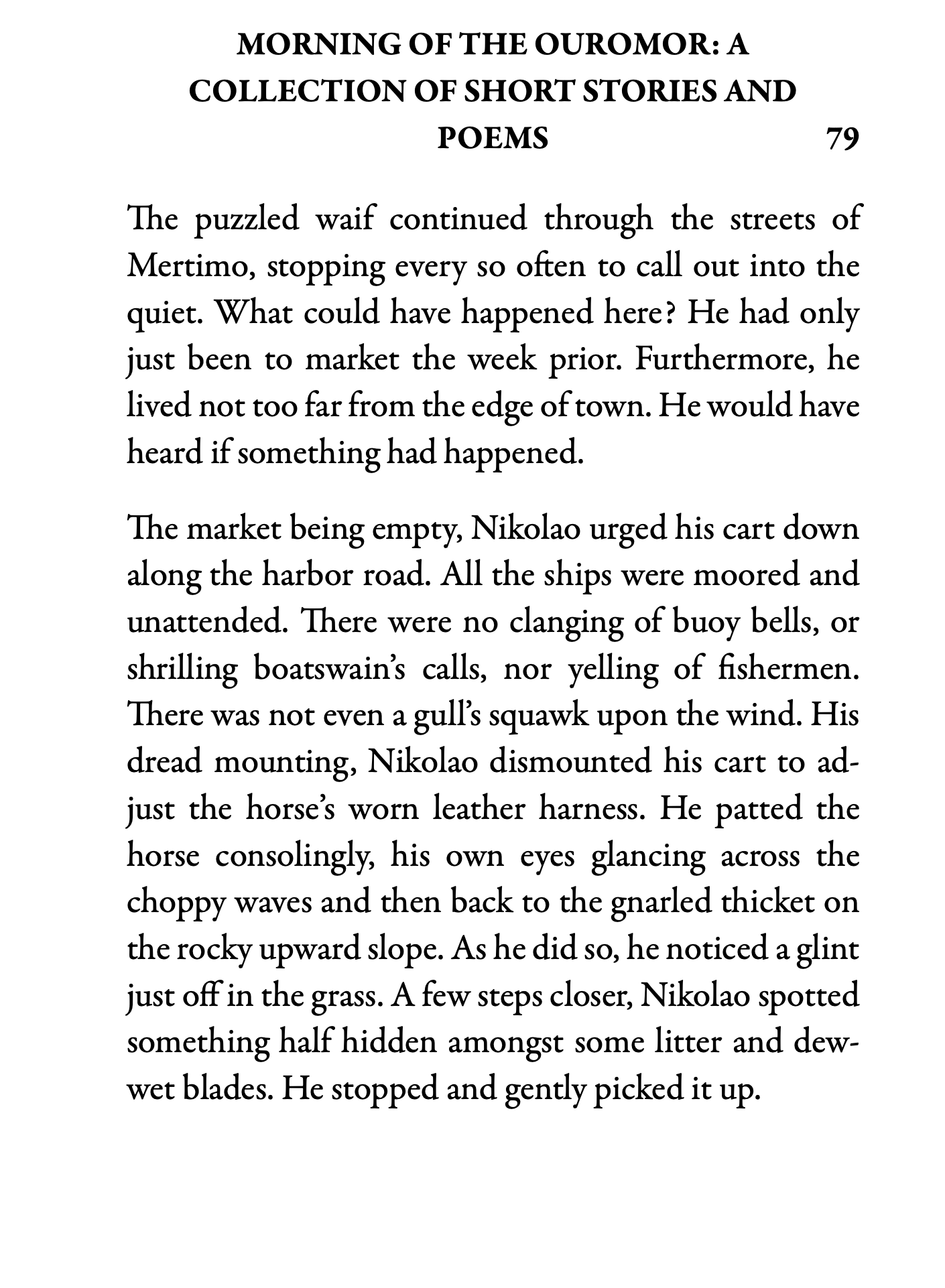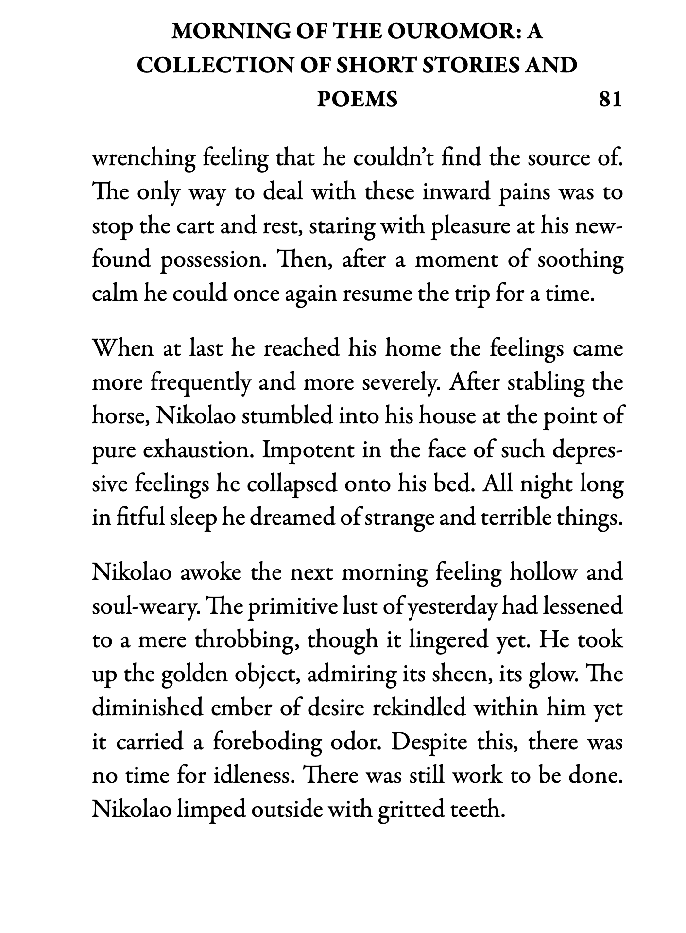 Arron Steep returns with his second collection of 10 short stories and 10 poems. Ponder the fate of a town affected by a mysterious curse in the featured short story “Morning of the Ouromor”. Experience wonder and sentiment in “Long in Tooth”, “February, 1941 by Grant Wood” and “Awutku”. Immerse yourself in the youthful passion of “Keys to the Castle”. Celebrate the intimate moments of overcoming trauma in “Broken Man”, “The Gossamer Lady” and “Birds of Thieves”. Meditate on the spiritual yearnings in “Dream of You” and “Paint and Daydreams”. Grapple with the dramatic tumult of “Venusians”, “Wives for Benjamin”, “August and June” and “Heaven’s Bride”. Confront the morbid, vulgar realities found in “Good Riddance, That Child”, “Halcyon Waves” and “Sterculius”. Last but not least, embark on the sundry epic adventures within “Glory”, “Vertex in Peril” and “Joyride”. Artfully interspersed in a rhythm of prose and verse, this collection by Arron Steep has something for everyone.