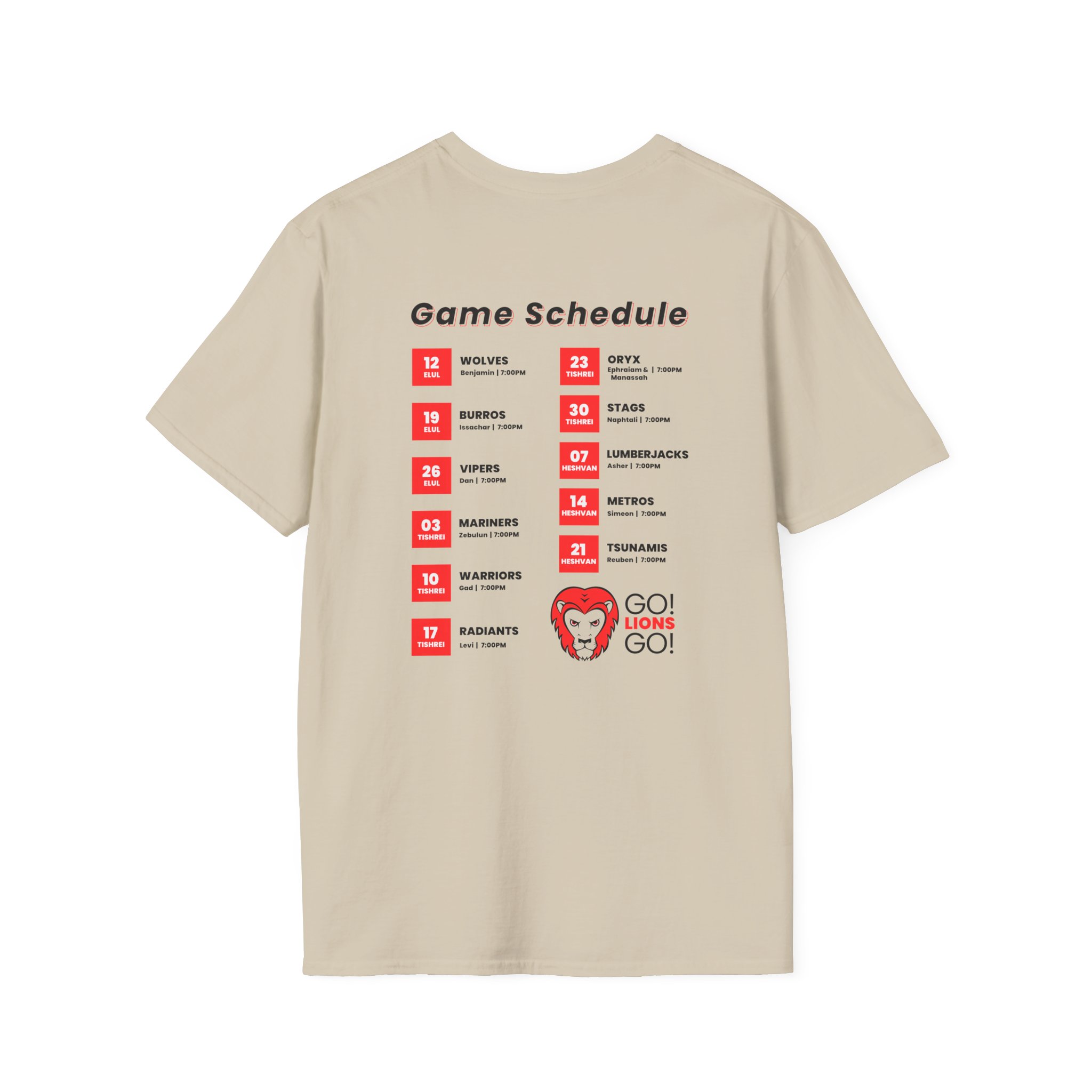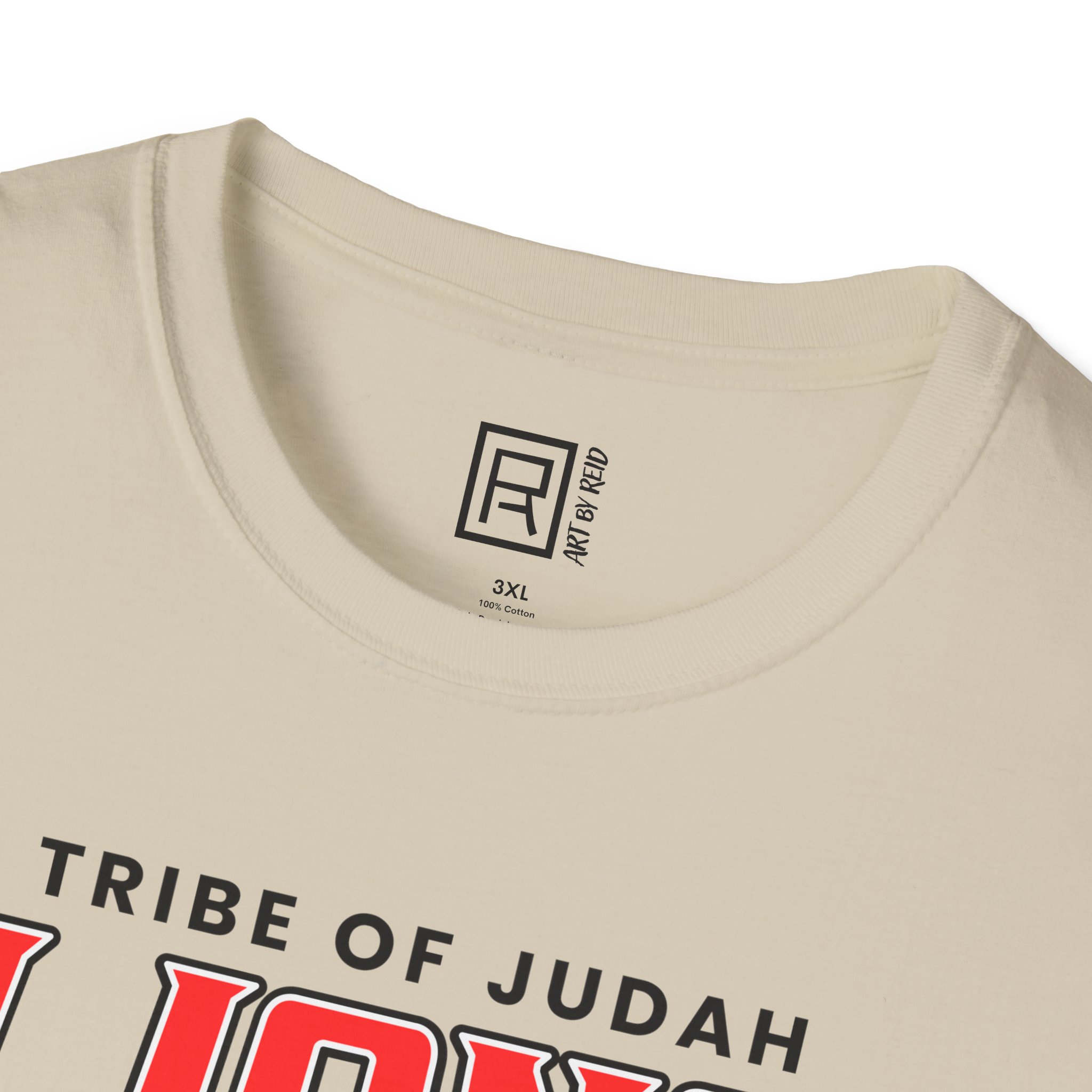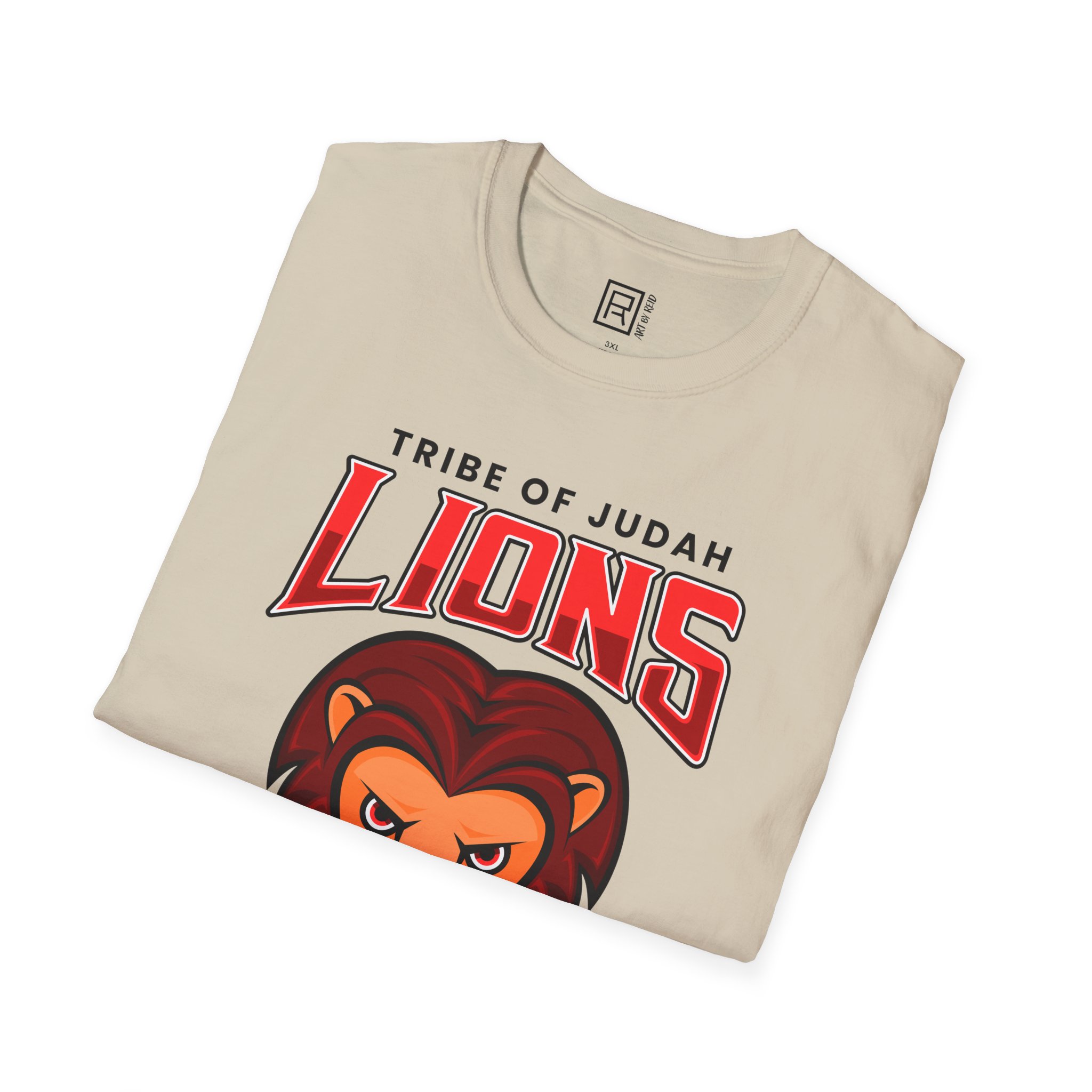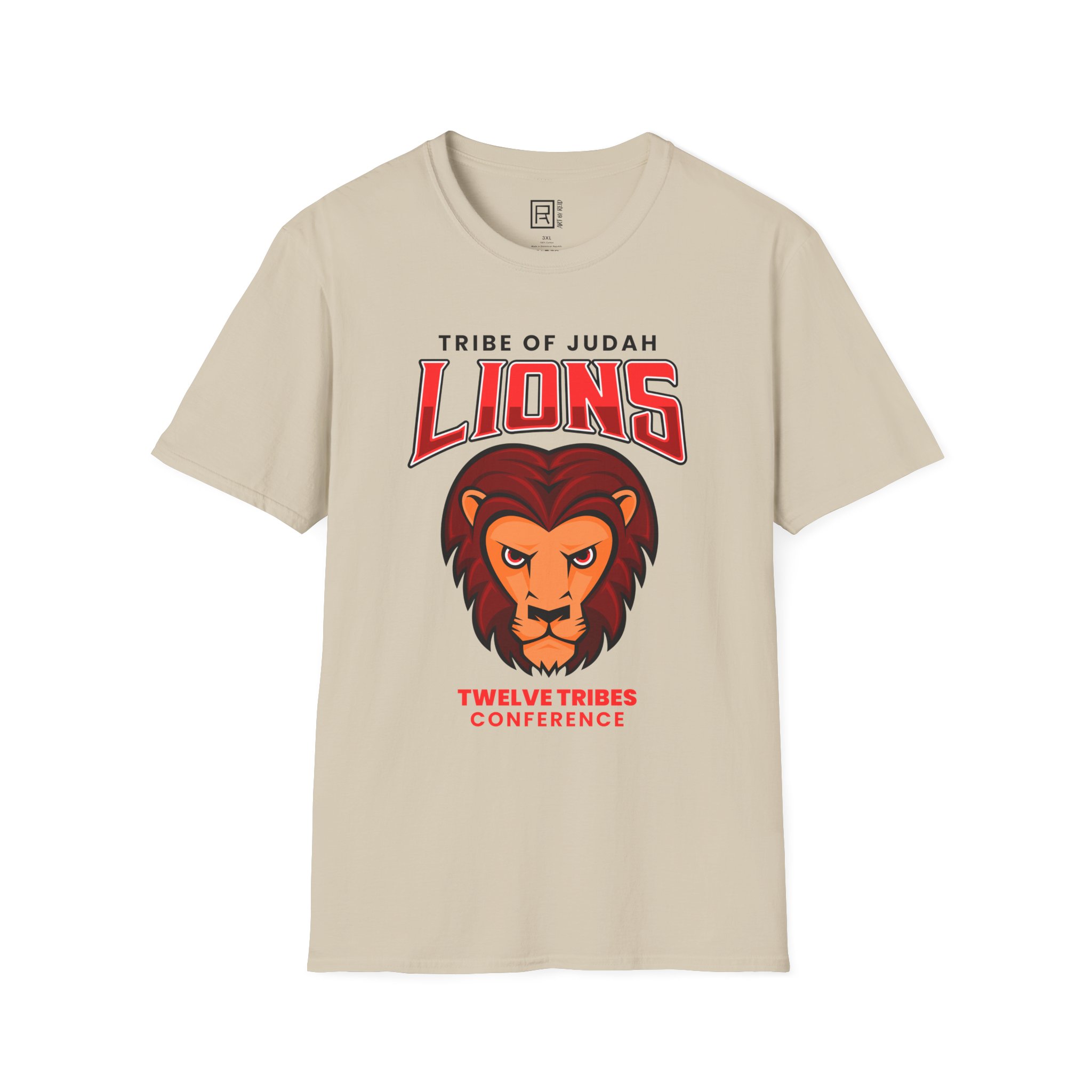 “Tribe of Judah” design on a sand-colored Gildan Unisex Softstyle T-Shirt. The t-shirt puts a new spin on casual comfort. Made from very soft materials. The shoulders have twill tape for improved durability. There are no side seams. The collar is made with ribbed knitting to prevent curling damage.
