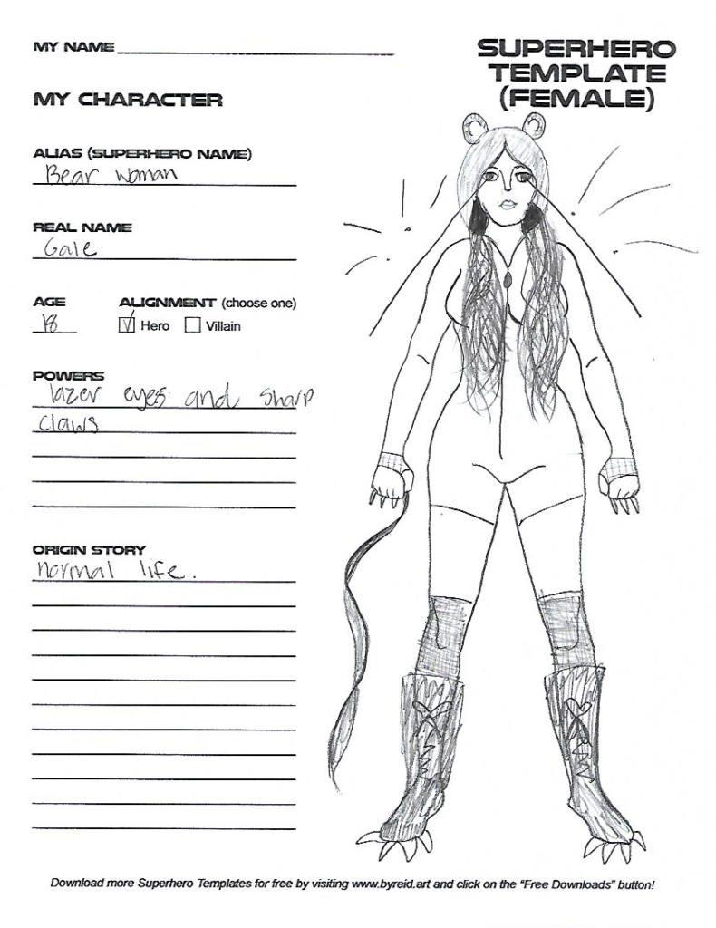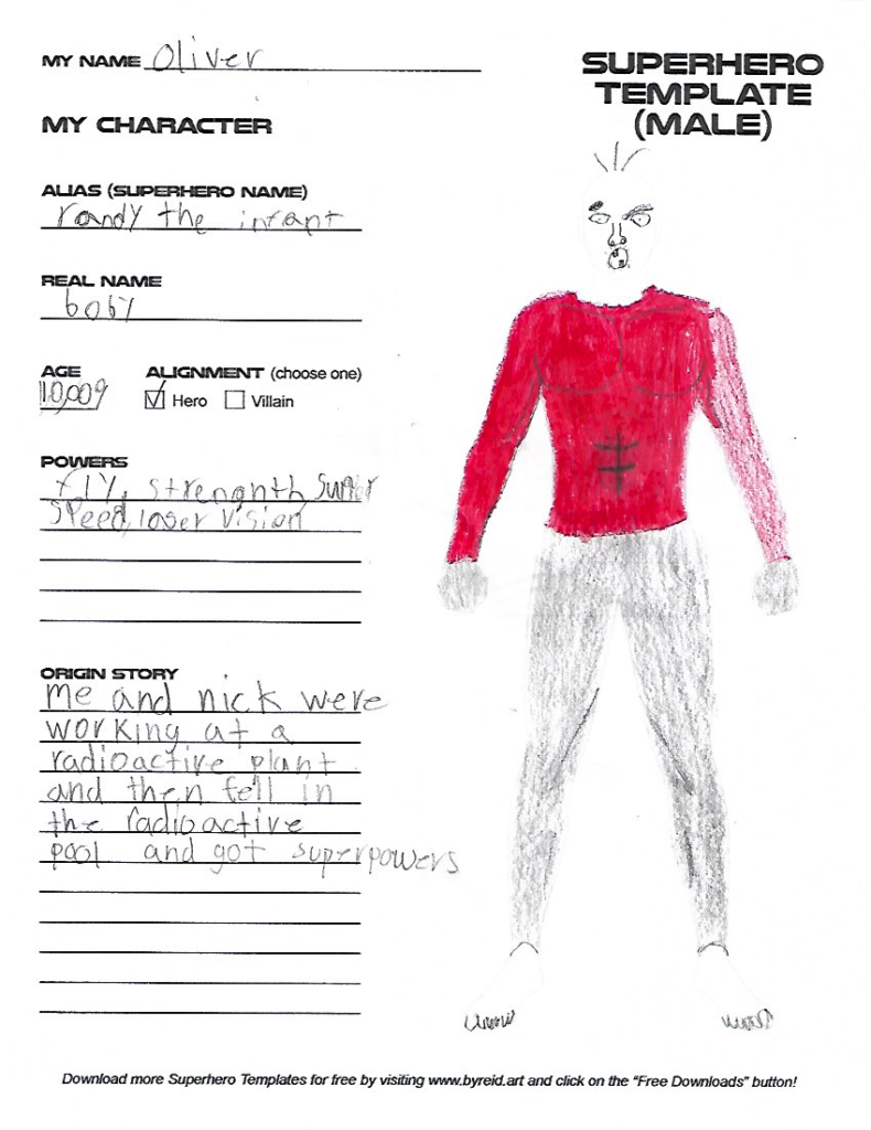 Download and print the FREE Superhero Drawing Template to create your very own hero or villain. Once you’ve finished designing your character’s costume, name, superpowers, and origin story, I’d love to see them! Scan or take a picture of your completed drawing and email them to Mr. Peterson: [email protected]. Your drawing will then be permanently featured in the Kids’ Artwork Gallery below as well as on the back cover of a future issue. Furthermore, your character will have an appearance in a future comic book storyline!